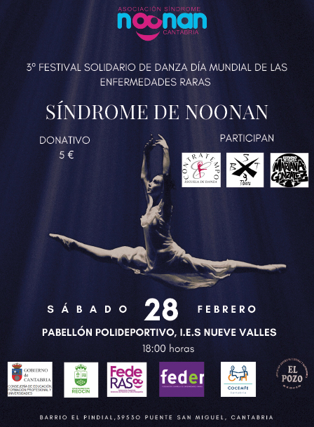 El Pabellón del IES Nueve Valles acoge este sábado el 3º Festival Solidario de Danza. El evento busca recaudar fondos y reivindicar el Día Mundial de las Enfermedades Raras, apoyando directamente a la Asociación Síndrome de Noonan de Cantabria (ASNC).