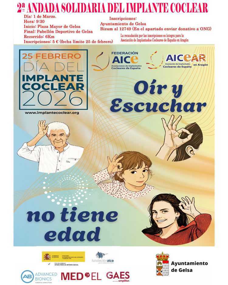 El municipio de Gelsa reafirma su compromiso con la inclusión social convocando la II Andada Solidaria del Implante Coclear para el próximo domingo 1 de marzo. Bajo la premisa de que la recuperación auditiva es vital en todas las etapas de la vida, el evento destinará su recaudación íntegra a la Asociación de Implantados Cocleares de España en Aragón (AICEAR).